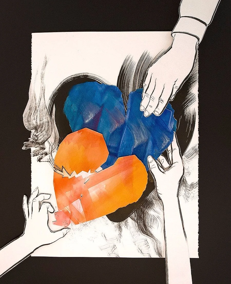 The curvy, dimpled shape with its pointed end often borders on cliché in modern culture. It commonly elicits the response and usage for a cute, airy, and sweet type of love, while in actuality, our hearts rarely stay in this sweet spot long. Jennifer takes the shape on a visual journey depicting it from a multitude of perspectives, acknowledging that the state of one’s heart is in constant flux.